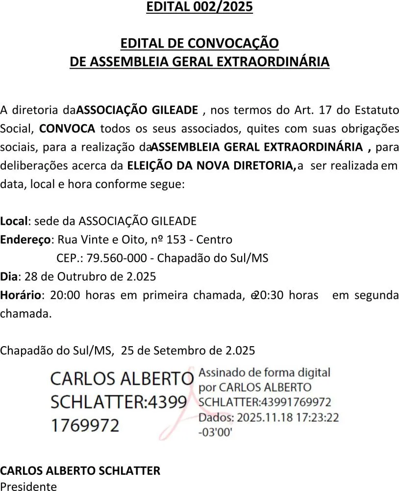 A diretoria da ASSOCIAÇÃO GILEADE, nos termos do Art. 17 do Estatuto Social, CONVOCA todos os seus associados, quites com suas obrigações sociais, para a realização da ASSEMBLEIA GERAL EXTRAORDINÁRIA, para deliberações acerca da ELEIÇÃO DA NOVA DIRETORIA, a ser realizada em data, local e hora conforme segue:
